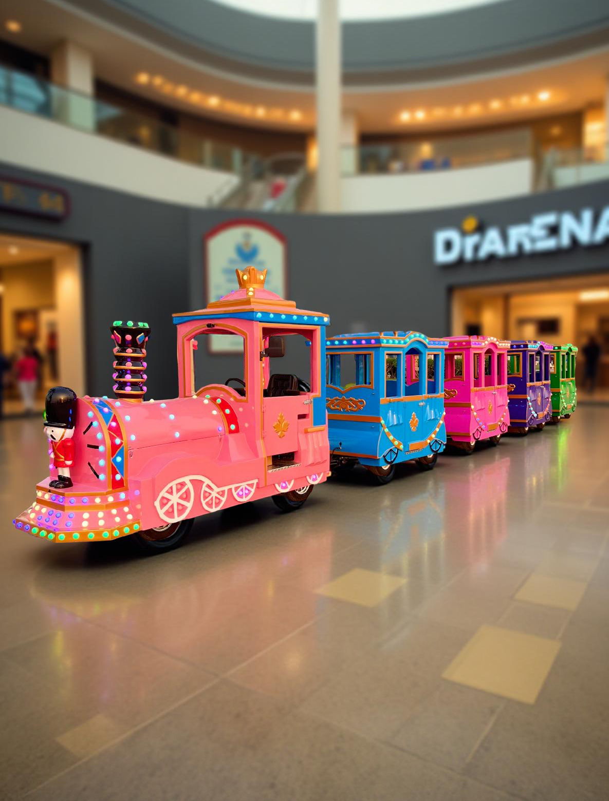 قطارات حديثة مناسبة للأطفال في المولات. تتميز هذه القطارات بألوان عرباتها وإضاءاتها التي تبعث البهجة للأطفال.لماذا قطارات عربات النزهة